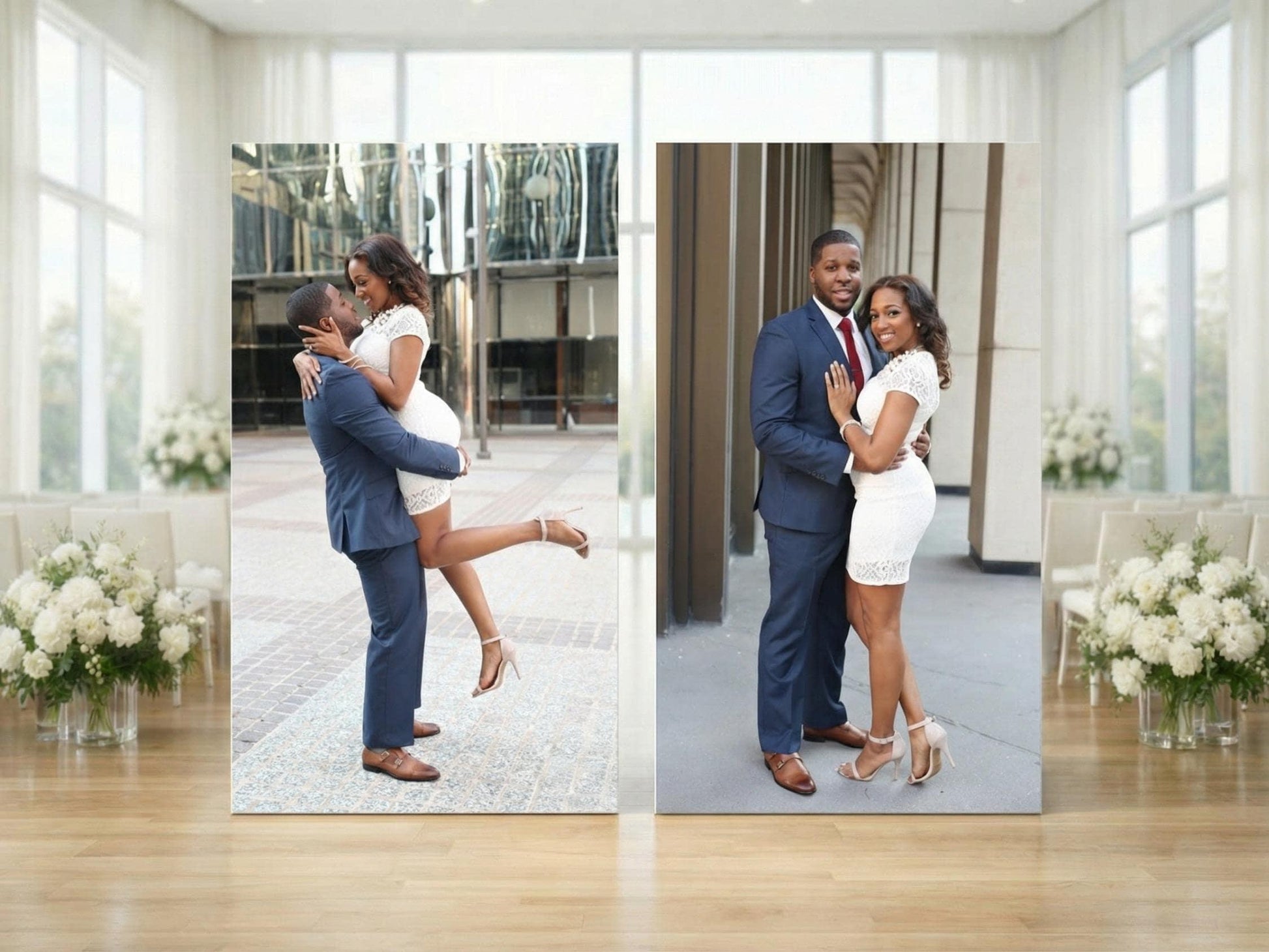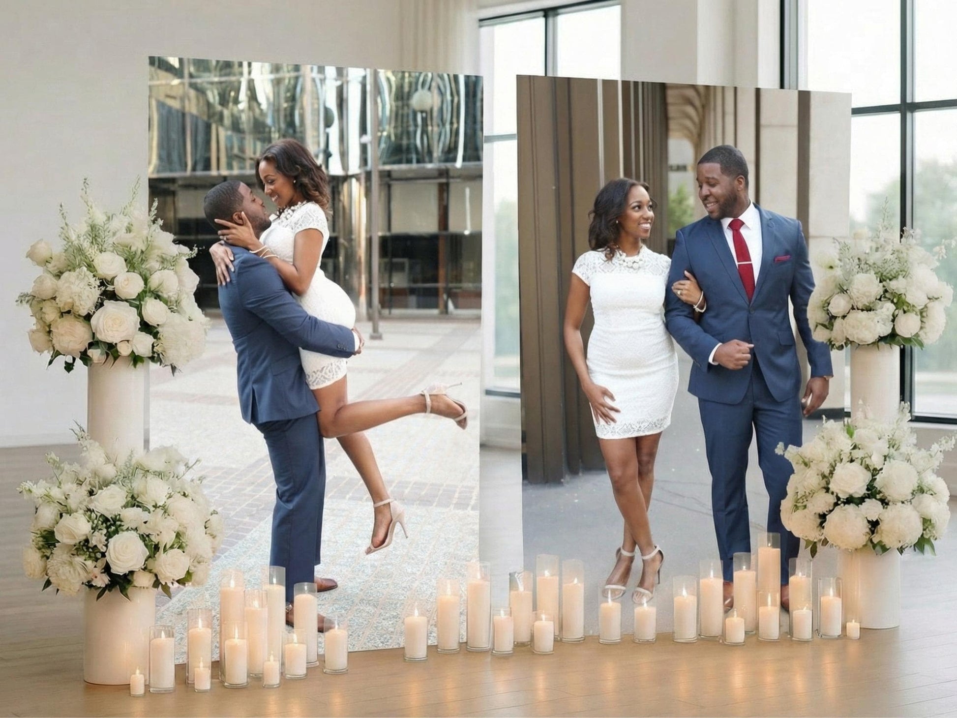 Custom Wedding Photo Boards & BackdropsCrafted for elegance and durability, each backdrop is UV printed directly onto the material for rich color and a smooth, seamless finish. Unlike vinyl overlays, UV printing will not peel, bubble, or fade-delivering a polished, professional look from the first photo to the last.Designed to perform at any celebration, these backdrops are suitable for indoor or outdoor use, rain or shine.Product Highlights